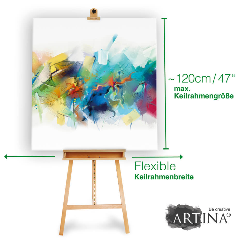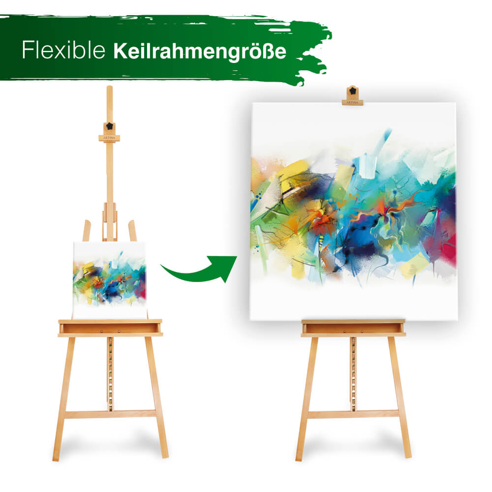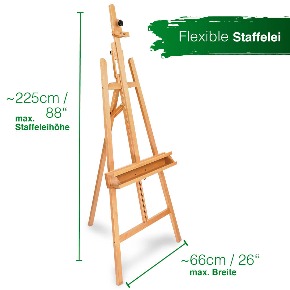 Grazie all'altezza molto elevata del quadro, pari a circa 120 cm, il cavalletto treppiede Barcelona è versatile e ideale per principianti, artisti amatoriali e per scopi decorativi/di presentazione.