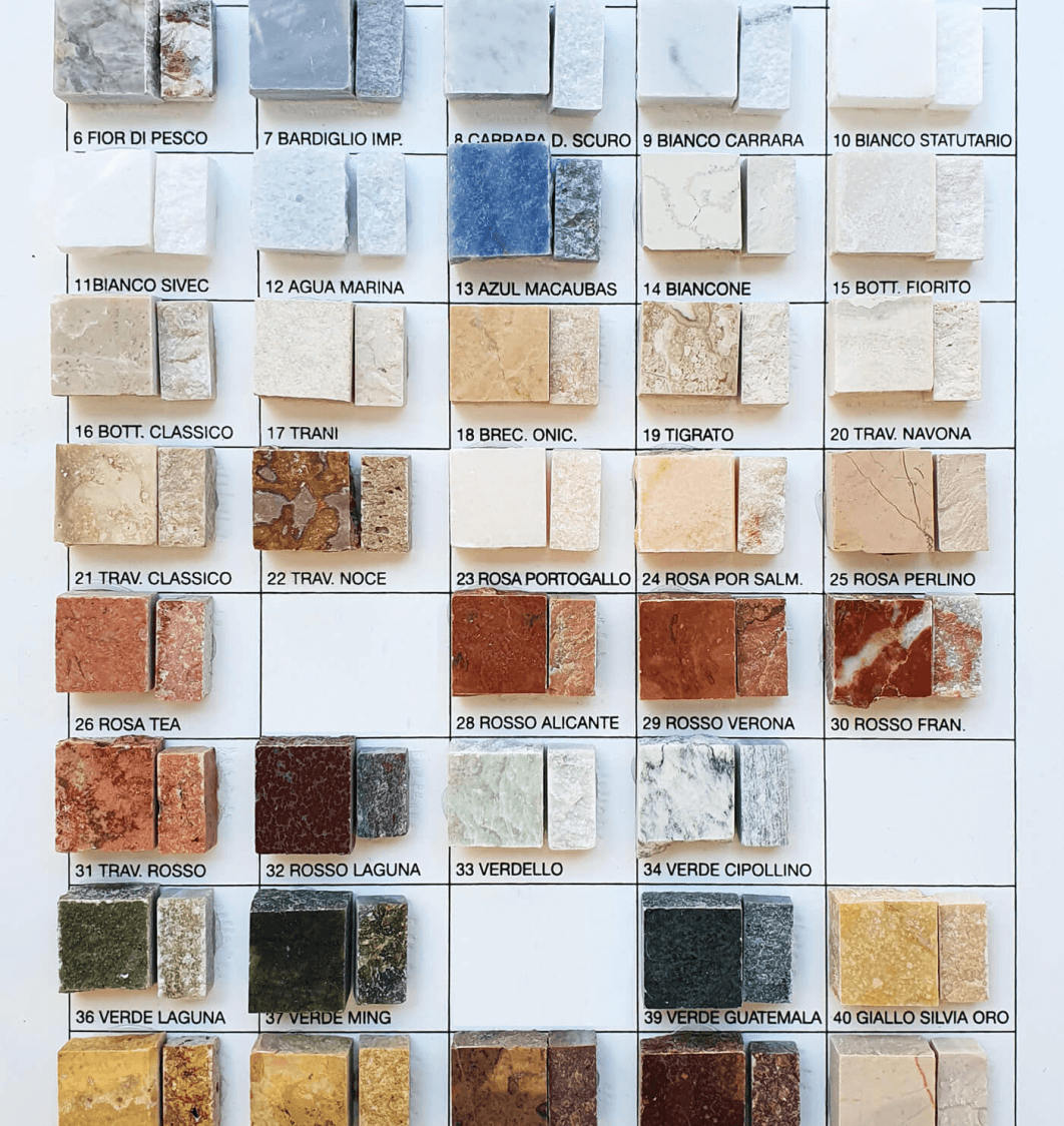 Nota Bene: le foto sono una rappresentazione generale del colore. I colori possono variare. I tagli delle TESSERE sono effettuati a mano, le misure indicate sono approssimative e i bordi del marmo possono presentare delle leggere imperfezioni.